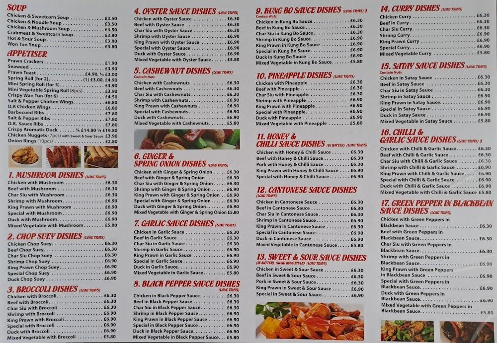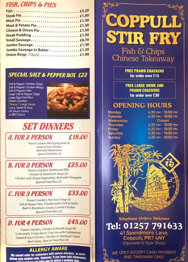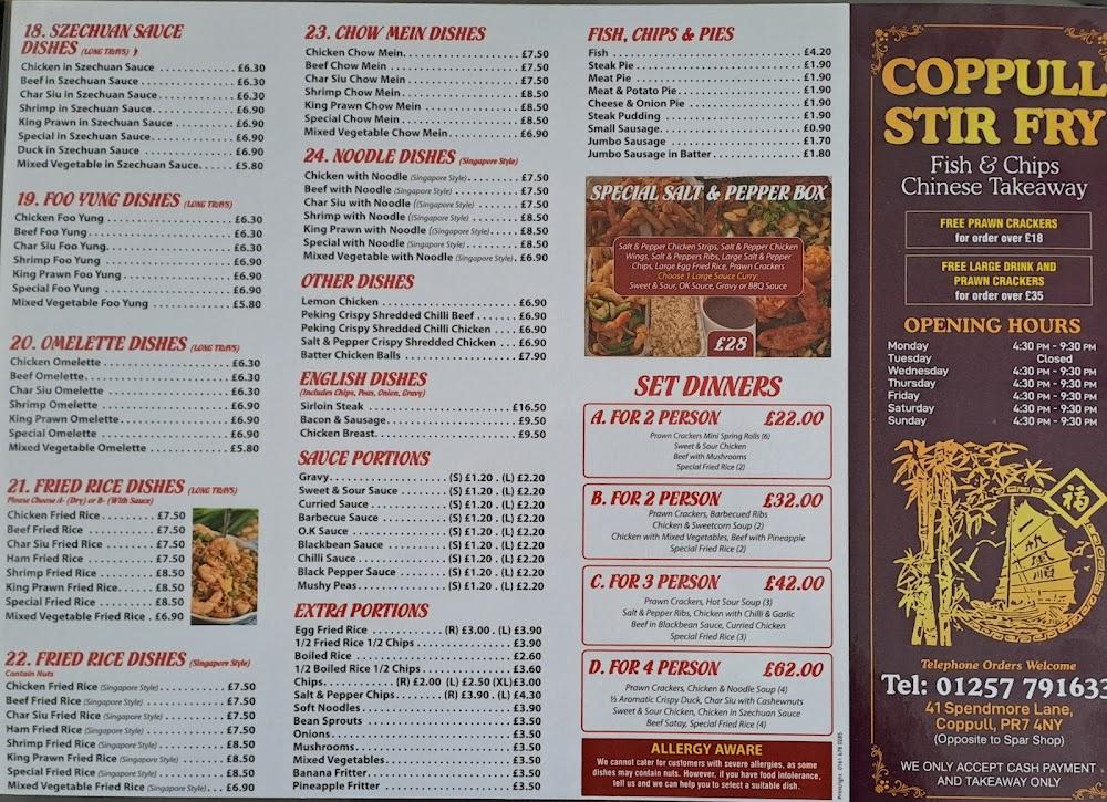 Coppull Stir Fry boasts an extensive menu filled with authentic Chinese favorites and British classics. The offerings include a variety of soup options such as Chicken & Sweetcorn and Hot & Sour, perfect for warming up on chilly nights. For those who crave a bit more, the Oyster Sauce Dishes and Kung Bo Sauce entrees cater to diverse palates, with dishes featuring chicken, beef, shrimp, and duck. Vegetarians and meat lovers alike can enjoy a selection of fried rice, curry, and chop suey dishes, made with the freshest ingredients.